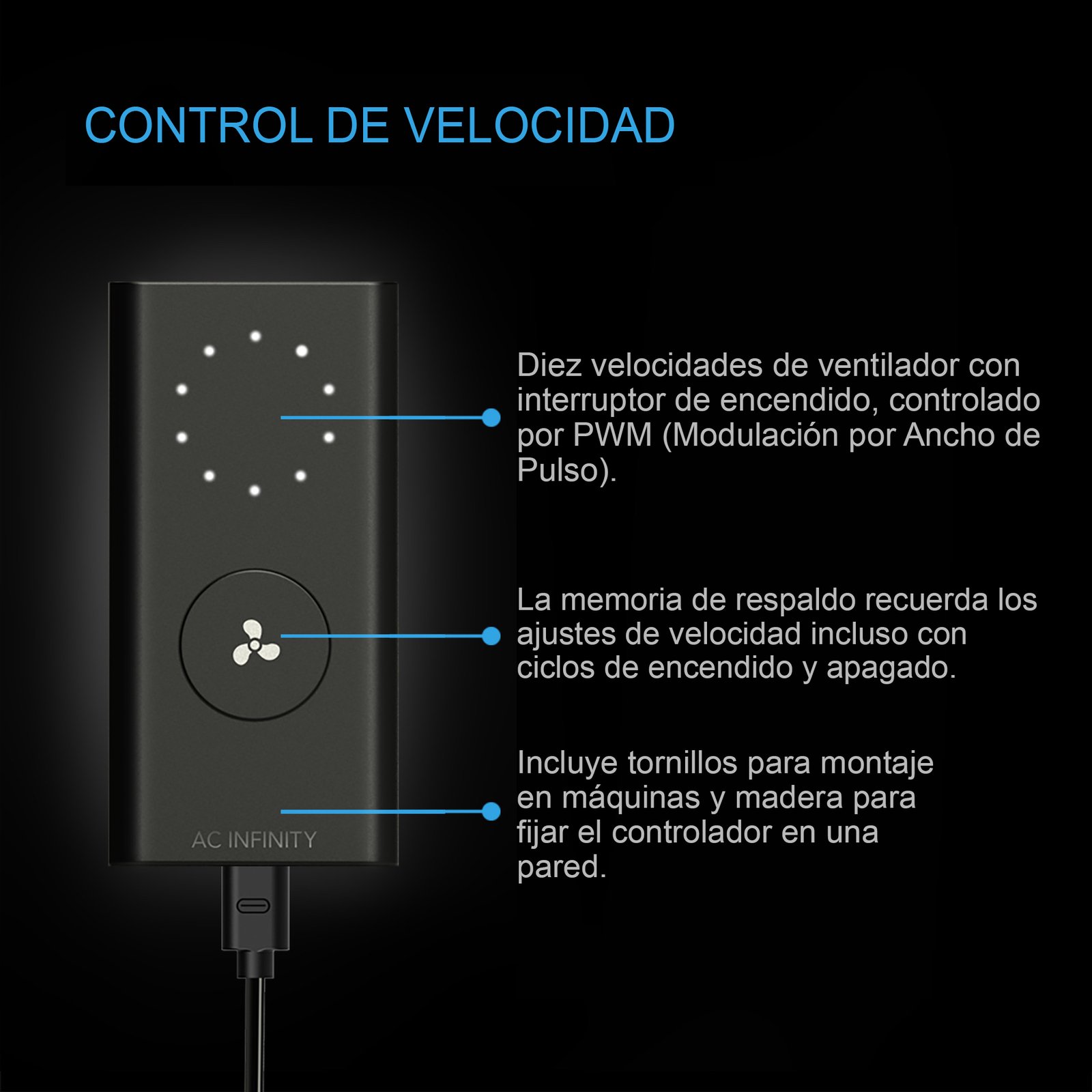 El controlador de velocidad le permite configurar la velocidad del ventilador de conducto entre diez niveles de velocidad para niveles óptimos de ruido y flujo de aire en varios entornos. El control preciso del flujo de aire está respaldado por el motor EC de vanguardia del ventilador en línea que se controla con precisión mediante PWM (modulación por ancho de pulso). Esto le permite funcionar sin problemas a velocidades de RPM extremadamente bajas sin generar ruido de motor. También cuenta con memoria de respaldo que conserva la última configuración de velocidad cuando se corta la energía del controlador.